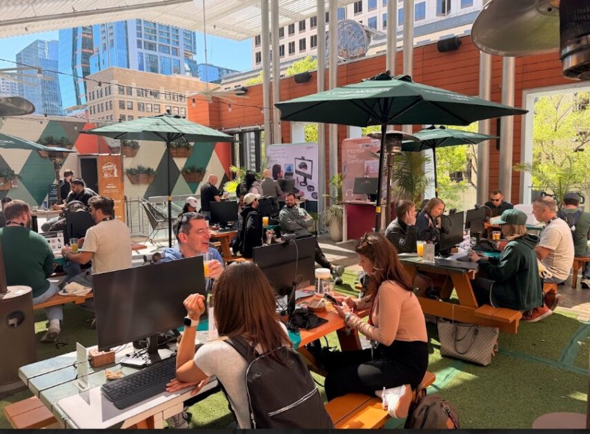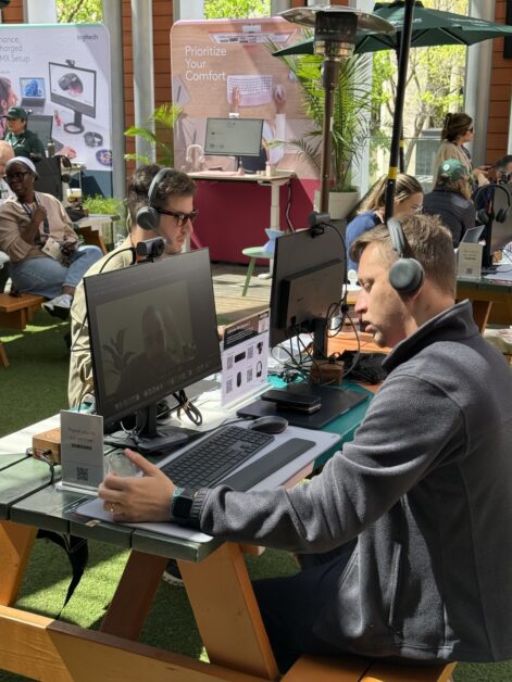 Featuring a fleet of 8 enterprise-grade personal workstations, a dedicated podcast studio, and a headset photo wall, the lounge became one of the hottest tickets in town.With eager guests lined up around the block, the lounge became the place everyone wanted to be—an essential hub for VIPs where access was as coveted as the experience inside. The workstations, decked out with mice, keyboards, headsets, webcams, and monitors, were fully functional. People plugged in their laptops with a simple USB cable and kept their workday moving-–this time in an airy, sunny “open workspace” on the corner of Congress St. and 7th— margarita in hand.
