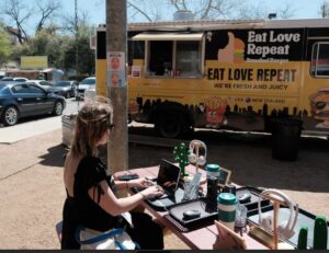 Journalists from the Austin American-Statesman, Entertainment Weekly, LA Times, Spectrum News, and the official SXSW media crew used our space to file stories, charge up, and hold informal meetings. After covering the Spielberg keynote, reporters from the Statesman used the lounge as their backdrop to interview attendees for Instagram reels.